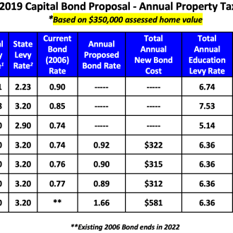 Due to changes by the state legislature, education-related property taxes increased in 2018. But these same changes also mean our education-related taxes will significantly decrease in 2019 because our local education levy rate will drop from $3.48 to $1.50 per $1,000 of assessed value. This means we can pass the new bond and still pay lower education-related taxes in 2020 than in 2018.